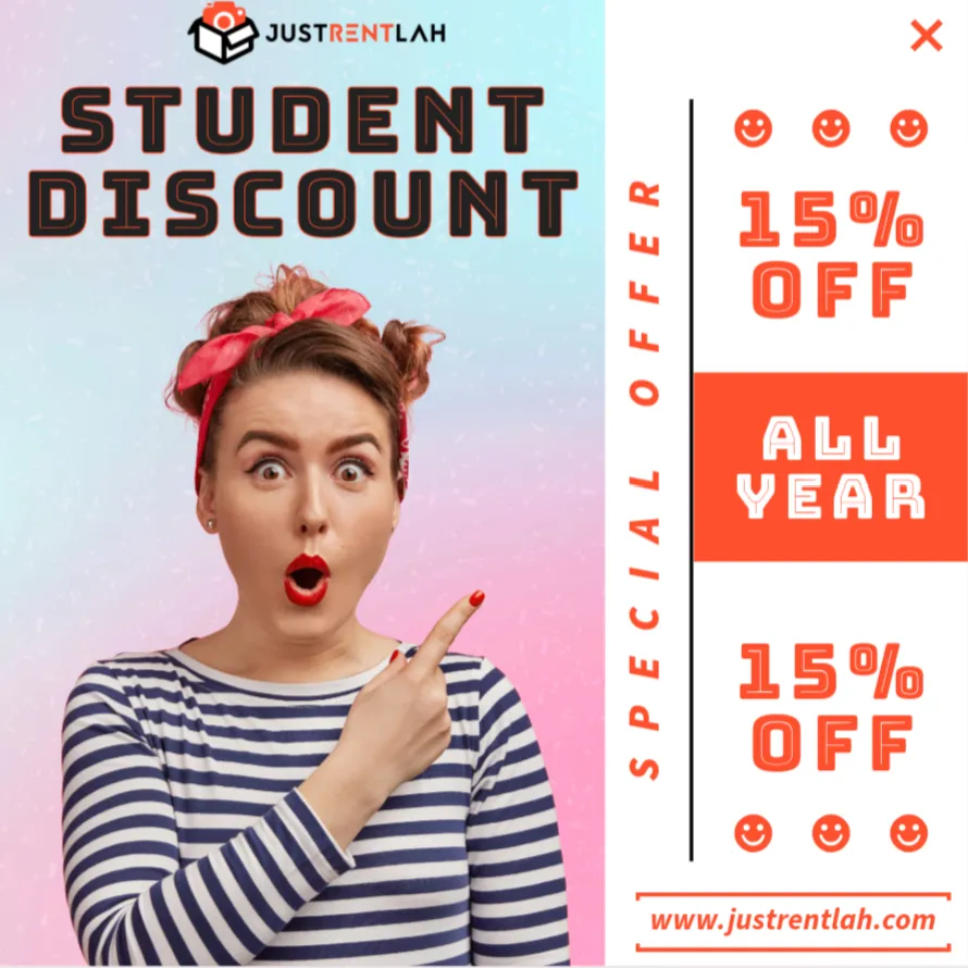 Unlock a year-round 15% discount on all orders (no minimum spend) at www.justrentlah.com with your student status.